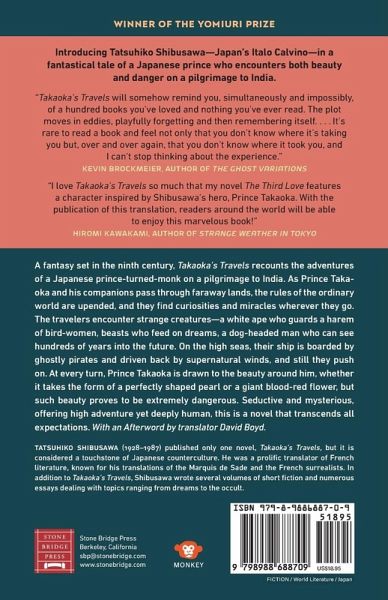 Winner of the Yomiuri Prize. Winner of the 2024-2025 Japan-U.S. Friendship Commission Prize for the Translation of Japanese Literature. Recipient of the 2022-23 William F. Sibley Memorial Subvention Award for Japanese Translation. Introducing Tatsuhiko Shibusawa-Japan's Italo Calvino?in this fantastical tale of a Japanese prince who encounters both beauty and danger on a pilgrimage to India. A fantasy set in the ninth century, Takaoka's Travels recounts the adventures of a Japanese prince-turned-monk on a pilgrimage to India. As Prince Takaoka and his companions pass through faraway lands, the rules of the ordinary world are upended, and they find curiosities and miracles wherever they go. The travelers encounter strange creatures--a white ape who guards a harem of bird-women, beasts who feed on dreams, a dog-headed man who can see hundreds of years into the future. On the high seas, their ship is boarded by ghostly pirates and driven back by supernatural winds, and still they push on. At every turn, Prince Takaoka is drawn to the beauty around him, whether it takes the form of a perfectly shaped pearl or a giant blood-red flower, but such beauty proves to be extremely dangerous. Seductive and mysterious, offering high adventure yet deeply human, this is a novel that transcends all expectations. With an afterword by translator David Boyd.