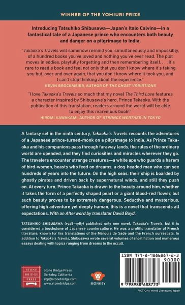 Winner of the Yomiuri Prize. Winner of the 2024-2025 Japan-U.S. Friendship Commission Prize for the Translation of Japanese Literature. Recipient of the 2022-23 William F. Sibley Memorial Subvention Award for Japanese Translation. Introducing Tatsuhiko Shibusawa-Japan's Italo Calvino?in this fantastical tale of a Japanese prince who encounters both beauty and danger on a pilgrimage to India. A fantasy set in the ninth century, Takaoka's Travels recounts the adventures of a Japanese prince-turned-monk on a pilgrimage to India. As Prince Takaoka and his companions pass through faraway lands, the rules of the ordinary world are upended, and they find curiosities and miracles wherever they go. The travelers encounter strange creatures--a white ape who guards a harem of bird-women, beasts who feed on dreams, a dog-headed man who can see hundreds of years into the future. On the high seas, their ship is boarded by ghostly pirates and driven back by supernatural winds, and still they push on. At every turn, Prince Takaoka is drawn to the beauty around him, whether it takes the form of a perfectly shaped pearl or a giant blood-red flower, but such beauty proves to be extremely dangerous. Seductive and mysterious, offering high adventure yet deeply human, this is a novel that transcends all expectations. With an afterword by translator David Boyd.