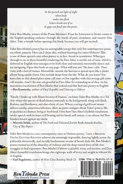 In the passed-out light of night when body melts into flesh letters break out of us & gaps are fired into the poem. Take a Breath catapults you right into the frenzy spiral of Yakir Ben-Moshe's dating life. Against the backdrop of violence, war, and trauma that has always permeated Israeli society and shaped the personal as well as the political discourse, the round dance of lovers entering and exiting and re-entering the poet's life takes on a timeless quality. The passionate vows and furious arguments between Ben-Moshe and his girlfriends, their break-ups and lovemaking in sweltering and noisy Tel Aviv are both a respite from and a mirror of the upheaval and breathlessness of day-to-day life in a country whose citizens constantly expect the unexpected. Their longing for simplicity, their solitude and clamoring for attention, their wit, self-doubt and cynicism all become tangible in Dan Alter's brilliant, playful, and vibrant translation. About the Author Yakir Ben-Moshe, an Israeli poet of Iraqi descent, won the Prime Minister's Prize for Literature in 2012. He has published five books of poetry and one of children's literature. His poems have been translated into English, Russian, Greek, Chinese and Turkish. He lives with his wife and children in Tel Aviv, where he is the Director of the Bialik House, as well as a teacher of creative writing. About the Translator Dan Alter's poems, translations and reviews have been published widely; his first collection "My Little Book of Exiles" won the Poetry Prize for the 2022 Cowan Writer's Awards. "Hills Full of Holes," his second collection, will be published by Fernwood Press in 2025. He lives with his wife and daughter in Berkeley where he works at the Magnes Collection of Jewish Art and Life.