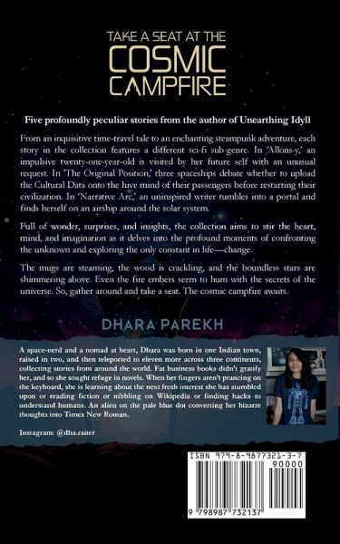 Five profoundly peculiar short stories from the author of Unearthing Idyll From an inquisitive time-travel tale to an enchanting steampunk adventure, each story in the collection features a different sci-fi sub-genre. In 'Allons-y!,' an impulsive twenty-one-year-old is visited by her future self with an unusual request. In 'The Original Position,' three spaceships debate whether to upload the Cultural Data onto the hive mind of their passengers before restarting their civilization. In 'Narrative Arc,' an uninspired writer tumbles into a portal and finds herself on an airship around the solar system. Full of wonder, surprises, and insights, the collection aims to stir the heart, mind, and imagination as it delves into the profound moments of confronting the unknown and exploring the only constant in life-change. The mugs are steaming, the wood is crackling, and the boundless stars are shimmering above. Even the fire embers seem to hum with the secrets of the universe. So, gather around and take a seat. The cosmic campfire awaits.