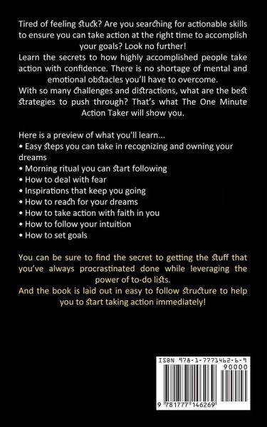 Tired of feeling stuck? Are you searching for actionable skills to ensure you can take action at the right time to accomplish your goals? Look no further! Learn the secrets to how highly accomplished people take action with confidence. There is no shortage of mental and emotional obstacles you'll have to overcome. With so many challenges and distractions, what are the best strategies to push through? That's what The One Minute Action Taker will show you. Here is a preview of what you'll learn...Easy steps you can take in recognizing and owning your dreams Morning ritual you can start following How to deal with fear Inspirations that keep you going How to reach for your dreams How to take action with faith in you How to follow your intuition How to set goals You can be sure to find the secret to getting the stuff that you've always procrastinated done while leveraging the power of to-do lists. And the book is laid out in easy to follow structure to help you to start taking action immediately!