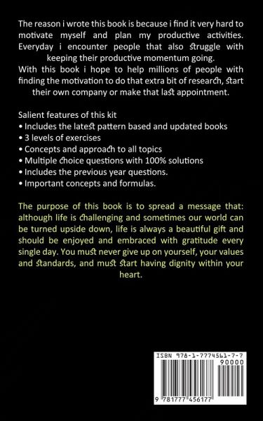 The reason i wrote this book is because i find it very hard to motivate myself and plan my productive activities. Everyday i encounter people that also struggle with keeping their productive momentum going. With this book i hope to help millions of people with finding the motivation to do that extra bit of research, start their own company or make that last appointment. Salient features of this kitIncludes the latest pattern based and updated books 3 levels of exercises Concepts and approach to all topics Multiple choice questions with 100% solutions Includes the previous year questions. Important concepts and formulas. The purpose of this book is to spread a message that: although life is challenging and sometimes our world can be turned upside down, life is always a beautiful gift and should be enjoyed and embraced with gratitude every single day. You must never give up on yourself, your values and standards, and must start having dignity within your heart.