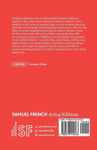Intriguing glimpses into a cupboard full of family skeletons, together with some serious, and not so serious, detective work, combine in this unusual suspense play, to keep everyone guessing until the very last page! Returning home from prison, after serving fifteen years for allegedly murdering his mother, Matthew finds his three sisters, his wife and his father waiting for him. Still protesting his innocence, Matthew's arrival prompts the question of who did kill Mother - scornful Celia, dotty Emma, cold Lavinia, flighty Gilda or even gentle Father? Accusations and hypotheses abound, but it takes an apparent suicide, and a good deal of amateur sleuthing, before the truth is revealed and the lady can be taken away...4 women, 3 men