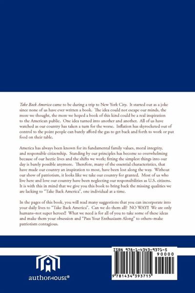 Take Back America came to be during a trip to New York City. It started out as a joke since none of us have ever written a book. The idea could not escape our minds, the more we thought, the more we hoped a book of this kind could be a real inspiration to the American public. One idea turned into another and another. All of us have watched as our country has taken a turn for the worse. Inflation has skyrocketed out of control to the point people can barely afford the gas to get back and forth to work or put food on their table. America has always been known for its fundamental family values, moral integrity, and responsible citizenship. Standing by our principles has become so overwhelming because of our hectic lives and the shifts we work; fitting the simplest things into our day is barely possible anymore. Therefore, many of the essential characteristics, that have made our country an inspiration to most, have been lost along the way. Without our show of patriotism, it looks like we take our country for granted. Most of us who live here and love our country have been neglecting our responsibilities as U.S. citizens. It is with this in mind that we give you this book to bring back the missing qualities we are lacking to "Take Back America", one individual at a time. In the pages of this book, you will read many suggestions that you can incorporate into your daily lives to "Take Back America". Can we do them all? NO WAY!! We are only humans-not super heroes!! What we need is for all of you to take some of these ideas and make them your obsession and "Pass Your Enthusiasm Along" to others-make patriotism contagious.