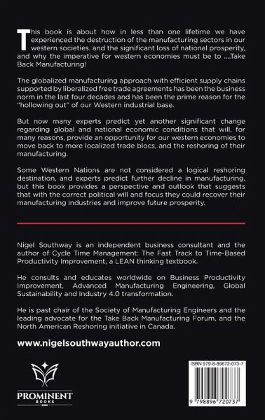 This book is about how in less than one lifetime we have experienced the destruction of the manufacturing sectors in our western societies. and the significant loss of national prosperity, and why the imperative for western economies must be to ....Take Back Manufacturing! The globalized manufacturing approach with efficient supply chains supported by liberalized free trade agreements has been the business norm in the last four decades and has been the prime reason for the "hollowing out" of our Western industrial base. But now many experts predict yet another significant change regarding global and national economic conditions that will, for many reasons, provide an opportunity for our western economies to move back to more localized trade blocs, and the reshoring of their manufacturing. Some Western Nations are not considered a logical reshoring destination, and experts predict further decline in manufacturing, but this book provides a perspective and outlook that suggests that with the correct political will and focus they could recover their manufacturing industries and improve future prosperity.