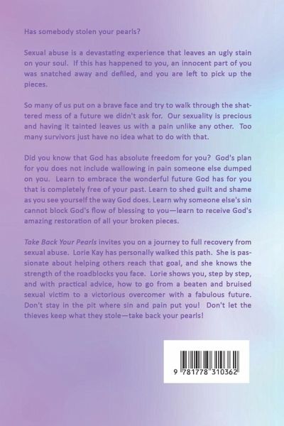 Has somebody stolen your pearls? Sexual abuse is a devastating experience that leaves an ugly stain on your soul. If this has happened to you, an innocent part of you was snatched away and defiled, and you are left to pick up the pieces. So many of us put on a brave face and try to walk through the shattered mess of a future we didn't ask for. Our sexuality is precious and having it tainted leaves us with a pain unlike any other. Too many survivors just have no idea what to do with that. Did you know that God has absolute freedom for you? God's plan for you does not include wallowing in pain someone else dumped on you. Learn to embrace the wonderful future God has for you that is completely free of your past. Learn to shed guilt and shame as you see yourself the way God does. Learn why someone else's sin cannot block God's flow of blessing to you-learn to receive God's amazing restoration of all your broken pieces. Take Back Your Pearls invites you on a journey to full recovery from sexual abuse. Lorie Kay has personally walked this path. She is passionate about helping others reach that goal, and she knows the strength of the roadblocks you face. Lorie shows you, step by step, and with practical advice, how to go from a beaten and bruised sexual victim to a victorious overcomer with a fabulous future. Don't stay in the pit where sin and pain put you! Don't let the thieves keep what they stole-take back your pearls!