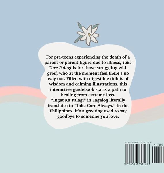 In this charmingly illustrated guidebook, young readers will discover a path to healing from grief caused by the extreme loss of a parent or parent-figure due to illness. Written from the viewpoint of a full-fledged adult who was once a self-proclaimed stubborn pre-teen dealing with the anguish of the sudden death of her beloved parent from terminal illness, this book gives real tips from someone who dealt with the same kind of loss. Organized into three distinct parts: "Memories Worth Remembering," "Dealing with the Hard Stuff," and "Truths to Remember," Take Care Palagi tackles grief through an interactive and clear method to help tween readers on their journey of healing. Filled with gentle words and thoughtful, calming illustrations and colors, this guidebook opens up readers to navigate their complex feelings and understand themselves. Take Care Palagi is a must for every young person struggling with the loss of a parent and emotions associated with grief. With this book, the path to healing is a little bit easier.