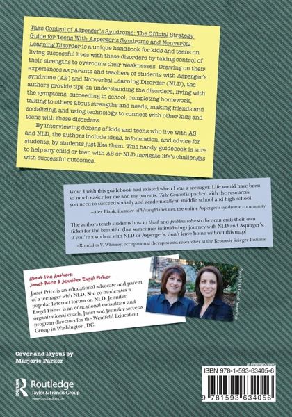 A gifted education Legacy Award winner, Take Control of Asperger's Syndrome: The Official Strategy Guide for Teens With Asperger's Syndrome and Nonverbal Learning Disorder is a unique handbook for kids and teens on living successful lives with these disorders by taking control of their strengths to overcome their weaknesses. Drawing on their experiences as parents and teachers of students with Asperger's syndrome (AS) and Nonverbal Learning Disorder (NLD), the authors provide tips on understanding the disorders, living with the symptoms, succeeding in school, completing homework, talking to others about strengths and needs, making friends and socializing, and using technology to connect with other kids and teens with these disorders. By interviewing dozens of kids and teens who live with AS and NLD, the authors include ideas, information, and advice for students, by students just like them. This handy guidebook is sure to help any child or teen with AS or NLD navigate life's challenges with successful outcomes. Named one of the Pennsylvania State Librarians Assoication's Young Adult Top Forty nonfiction books of 2010. Ages 10-16