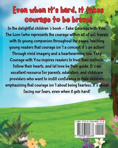 Even when it's hard, it takes courage to be brave! In the delightful children's book - Take Courage with You, The Lion (who represents the courage within all of us), travels with its young companion throughout the pages, teaching young readers that courage isn't a concept, it's an action! Through vivid imagery and a heartwarming tale, Take Courage with You inspires readers to trust their instincts, follow their hearts, and let love be their guide. It's an excellent resource for parents, educators, and childcare providers who want to instill confidence in their children, emphasizing that courage isn't about being fearless, it's about facing our fears, even when it gets hard!