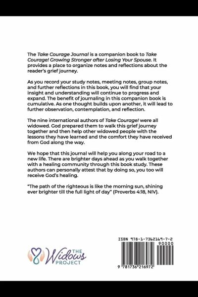 The Take Courage Journal is a companion book to Take Courage! Growing Stronger after Losing Your Spouse. It provides a place to organize notes and reflections about the reader's grief journey. As you record your study notes, meeting notes, group notes, and further reflections in this book, you will find that your insight and understanding will continue to progress and expand. The benefit of journaling in this companion book is cumulative. As one thought builds upon another, it will lead to further observation, contemplation, and reflection. The nine international authors of Take Courage! were all widowed. God prepared them to walk this grief journey together and then help other widowed people with the lessons they have learned and the comfort they have received from God along the way. We hope that this journal will help you along your road to a new life. There are brighter days ahead as you walk together with a healing community through this book study. These authors can personally attest that by doing so, you too will receive God's healing. "The path of the righteous is like the morning sun, shining ever brighter till the full light of day" (Proverbs 4:18, NIV).