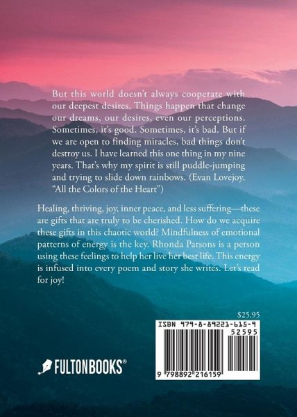 But this world doesn't always cooperate with our deepest desires. Things happen that change our dreams, our desires, even our perceptions. Sometimes, it's good. Sometimes, it's bad. But if we are open to finding miracles, bad things don't destroy us. I have learned this one thing in my nine years. That's why my spirit is still puddle-jumping and trying to slide down rainbows. (Evan Lovejoy, "All the Colors of the Heart") Healing, thriving, joy, inner peace, and less suffering--these are gifts that are truly to be cherished. How do we acquire these gifts in this chaotic world? Mindfulness of emotional patterns of energy is the key. Rhonda Parsons is a person using these feelings to help her live her best life. This energy is infused into every poem and story she writes. Let's read for joy!