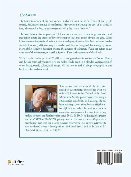 The Sonnets The Sonnets are one of the best known, and often most beautiful, forms of poetry. Of course, Shakespeare made them famous. His works are among the best of all time. In fact, his name has become synonymous with the name "Sonnet." The basic Sonnet is composed of 14 lines usually written in iambic pentameter, and frequently upon the theme of love or romance. But that is not always the case. What is best about a Sonnet is, that it is a structured type of poem, but that structure can be stretched in many different ways. It can be, and has been, argued that changing one or more of the elements does not change the essence of a Sonnet. If you can retain some or most of the elements, it is still a Sonnet. That is the premise of this book. Within it, the author presents 73 different configurations/formats of the Sonnet Form, and he has personally written 170 examples. Each poem is a blended composition of verse, background, colors, and image. All the poems and all the photographs in this book are the author's work.