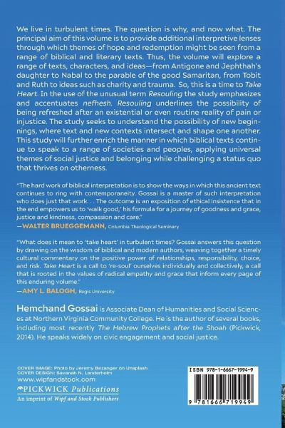 We live in turbulent times. The question is why, and now what. The principal aim of this volume is to provide additional interpretive lenses through which themes of hope and redemption might be seen from a range of biblical and literary texts. Thus, the volume will explore a range of texts, characters, and ideas--from Antigone and Jephthah's daughter to Nabal to the parable of the good Samaritan, from Tobit and Ruth to ideas such as charity and trauma. So, this is a time to Take Heart. In the use of the unusual term Resouling the study emphasizes and accentuates nefhesh. Resouling underlines the possibility of being refreshed after an existential or even routine reality of pain or injustice. The study seeks to understand the possibility of new beginnings, where text and new contexts intersect and shape one another. This study will further enrich the manner in which biblical texts continue to speak to a range of societies and peoples, applying universal themes of social justice and belonging while challenging a status quo that thrives on otherness.