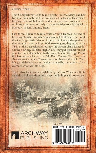 Tom Campbell vowed to take his sister-in-law, Mary, and her two sons back to Texas if his brother died in the war. He avoided keeping his word, but public and family pressure pushes him to get horses and wagons ready to make the trip from Springfield, Missouri, to San Antonio, Texas. Fate forces them to take a route around Kansas instead of traveling straight through Arkansas and Oklahoma. They meet the first, large cattle drive on its way to Abilene and experience the antics of crazy cowboys. With two wagons, they enter north Texas at the Caprocks and journey the barren Llano Estacado. On the howling, desolate High Plains, they get lost and run out of water. Luck steers them to the only place on the High Plains that has grass and water, the Palo Duro Canyon. Their joy soon changes to fear when Comanches spot them and attack. Tom, Mary, and the boys are miraculously saved by the actions of two cowboys who ride into help. The trials of the journey weigh heavily on Tom. When he reflects on his life, he knows he must change, but he hopes it's not too late.