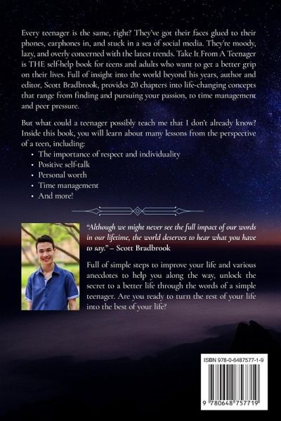 Every teenager is the same, right? They’ve got their faces glued to their phones, earphones in, and stuck in a sea of social media. They’re moody, lazy, and overly concerned with the latest trends. Take It From A Teenager is THE self-help book for teens and adults who want to get a better grip on their lives. Full of insight into the world beyond his years, author and editor, Scott Bradbrook, provides 20 chapters into life-changing concepts that range from finding and pursuing your passion, to time management and peer pressure. But what could a teenager possibly teach me that I don’t already know? Inside this book, you will learn about many lessons from the perspective of a teen, including the importance of respect and individuality, positive self-talk, personal worth, time management, and more. "Although we might never see the full impact of our words in our lifetime, the world deserves to hear what you have to say." Full of simple steps to improve your life and various anecdotes to help you along the way, unlock the secret to a better life through the words of a simple teenager. Are you ready to turn the rest of your life into the best of your life?