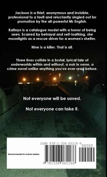 Jackson is a thief, anonymous and invisible, professional to a fault and reluctantly singled out for promotion by the all-powerful Mr English. Kathryn is a catalogue model with a horror of being seen. Scarred by betrayal and self-loathing, she moonlights as a rescue driver for a women's shelter. Nine is a killer. That is all. Three lives collide in a brutal, lyrical tale of underworlds within and without, a noir in verse, a crime thriller unlike anything you've ever read before. Not everyone will be saved. Not everyone can take it.