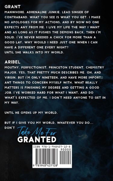 Grant Manwhore. Adrenaline junkie. Lead singer of ContraBand. What you see is what you get. I make no apologies for my actions, and by now no one expects any from me. I live my life the way I want and as long as it pushes the demons back, then I'm solid. I've never needed a chick for more than a good lay. Why would I need just one when I can have a different one every night? Until she walks into my world. Aribel Mouthy. Perfectionist. Princeton student. Chemistry major. Yes, that pretty much describes me. Oh, and virgin. But I'm only nineteen, and have more important things to concern myself with. What really matters is finishing my degree and getting a good job. I've worked hard for what I want, and do what's expected of me. I don't need anyone to get in my way. Until he opens up my world. But if I give you my world, whatever you do...don't take me for granted. Find out what happens with Grant and Aribel in part one of the Take Me duet!