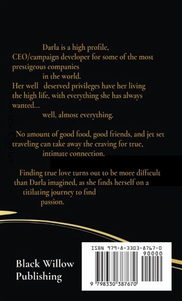 Darla is a high-profile CEO/campaign developer for some of the most prestigious companies in the world. Her well-deserved privileges have her living the high life, with everything she has always wanted ... well, almost everything. No amount of good food, good friends and jet set traveling can take away the craving for true, intimate connection. Finding true love turns out to be more difficult than Darla ever imagined as she finds herself on a titillating journey to find passion.