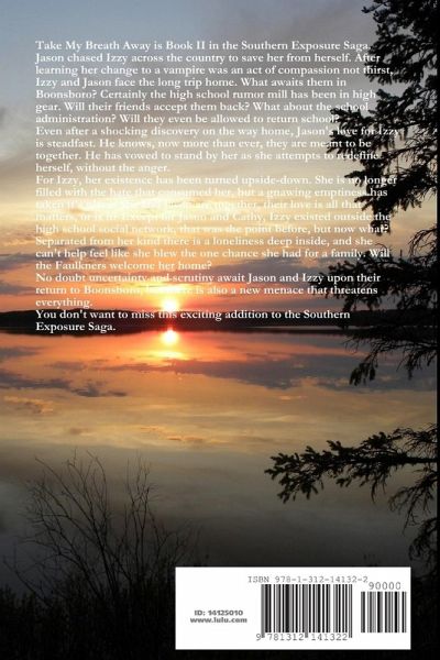 Take My Breath Away is Book II in the Southern Exposure Saga. Jason and Izzy's romance didn't end with their discovery in Forks, far from it. Not even their shocking discovery on the way home, or trying to cope with their unexpected living arrangement can prepare them for the new menace that cruises into Boonsboro threatening everything.