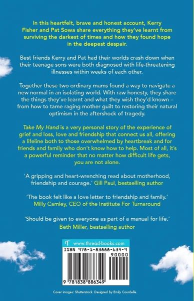 In this heartfelt, brave and honest account, Kerry Fisher and Pat Sowa share everything they've learnt from surviving the darkest of times. They shine a light on what it really feels like when your world shatters and how they found hope in the deepest despair. Best friends since they met at university, Kerry and Pat had no idea that thirty years later, they'd need every ounce of their friendship to survive. In 2017, their worlds came crashing down when their teenage sons were both diagnosed with life-threatening illnesses within weeks of each other. During the following rollercoaster months, Kerry and Pat regularly snatched time to message each other - often with black humour - providing a momentary refuge from their frightening realities. Together these two ordinary mums found a way to survive their extraordinary challenges and to navigate a new normal in an alien and isolating world. With raw honesty, they share the things they've learnt and what they wish they'd known - from how to tame raging mother guilt to restoring their natural optimism in the aftershock of tragedy. In this profoundly moving book, Kerry and Pat take readers on a very personal exploration of the universal experiences of grief and loss, love and friendship that connect us all. Like a wise companion offering comfort, Take My Hand is a lifeline both to those overwhelmed by heartbreak and for friends and family who don't know how to help. Most of all, it's a powerful reminder that no matter how difficult life gets, you are not alone. Read what people are saying about Take My Hand: 'A truly wonderful book …I found it ultimately optimistic and life-affirming. This book celebrates love - not only mother love, but the love of family and friends, the power of true friendship, and the power of simple kindness - how small kindnesses, particularly those of strangers, can make a difference to the daily life of someone who is on the edge of the abyss… not only will it provide vital support for anyone who finds themselves in a similar situation to Pat or Kerry, but it may just save a life.' Susan Elliot Wright 'Utterly beautiful. Heart-breaking, honest, raw, inspiring, brave, and eye-opening. The subject matter was handled so sensitively, and I think it will be something that many people find helpful.' Louise Beech 'Gut-wrenchingly powerful and moving but also, at times, unexpectedly hilarious. Crammed with insight, wisdom and love.' Nicola Gill 'Two women on a journey from suffering to hope and inspiring the reader to join them on the road. Inspired and inspiring.' Ged Flynn, CEO of Papyrus Prevention of Young Suicide 'The book felt like a love letter to friendship and family.' Milly Camley, CEO of the Institute For Turnaround 'A brave and brilliant book that is, in turn, wise, sharply funny, searingly sad, brave and honest. It is a testament to family and friendship, and to love, in all its colours...What Kerry and Pat have done is to make their experiences of loss and the fear of loss rise up from its pages, generously providing checklists for others who may be navigating grief, in all its colours.' Claire Dyer