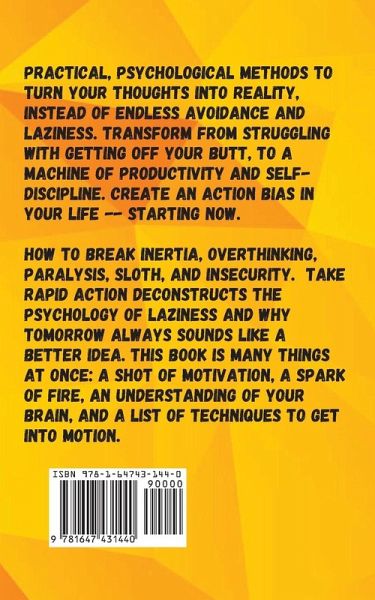 Practical, psychological methods to turn your thoughts into reality, instead of endless avoidance and laziness. Transform from struggling with getting off your butt, to a machine of productivity and self-discipline. Create an action bias in your life -- starting now. How to break inertia, overthinking, paralysis, sloth, and insecurity. Take Rapid Action deconstructs the psychology of laziness and why tomorrow always sounds like a better idea. This book is many things at once: a shot of motivation, a spark of fire, an understanding of your brain, and a list of techniques to get into motion.…mehr
