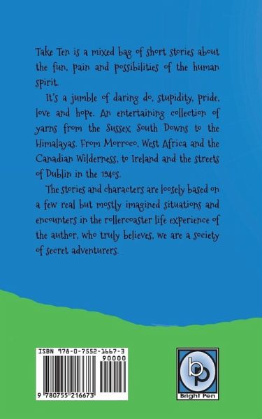 Take Ten is a mixed bag of short stories about the fun, pain and possibilities of the human spirit. It's a jumble of daring do, stupidity, pride, love and hope. An entertaining collection of yarns from the Sussex South Downs to the Himalayas. From Morroco, West Africa and the Canadian Wilderness, to Ireland and the streets of Dublin in the 1940s. The stories and characters are loosely based on a few real but mostly imagined situations and encounters in the rollercoaster life experience of the author, who truly believes, we are a society of secret adventurers.