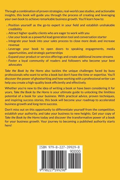 Through a combination of proven strategies, real-world case studies, and actionable insights, this book will guide you through the process of creating and leveraging your own book to achieve remarkable business growth. You'll learn how to: 1. Position yourself as the go-to expert in your field and establish unshakable credibility 2. Attract higher-quality clients who are eager to work with you 3. Use your book as a powerful lead generation tool and conversation starter 4. Integrate your book into your sales process to close more deals and increase revenue 5. Leverage your book to open doors to speaking engagements, media opportunities, and strategic partnerships 6. Expand your product or service offerings and create additional income streams 7. Foster a loyal community of readers and followers who become your best advocates Take the Book by the Horns also tackles the unique challenges faced by busy professionals who want to write a book but don't have the time or expertise. You'll discover the power of ghostwriting and how working with a professional writer can help you create a high-quality book efficiently and effectively. Whether you're new to the idea of writing a book or have been considering it for years, Take the Book by the Horns is your ultimate guide to unlocking the limitless potential of a book for your business. With practical advice, proven techniques, and inspiring success stories, this book will become your roadmap to accelerated business growth and long-term success. Don't miss out on this opportunity to differentiate yourself from the competition, establish your authority, and take your business to new heights, and discover the transformative power of a book for your business growth. Your journey to becoming a published authority starts here!