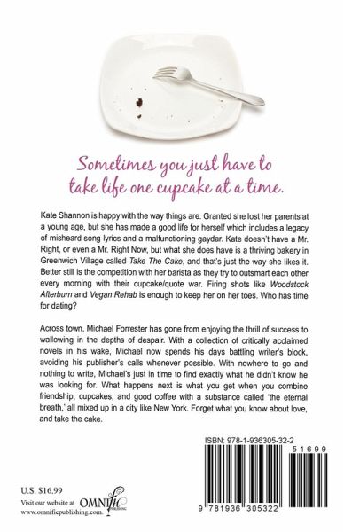 Sometimes you just have to take life one cupcake at a time. Kate Shannon is happy with the way things are. Granted she lost her parents at a young age, but she has made a good life for herself which includes a legacy of misheard song lyrics and a malfunctioning gaydar. Kate doesn't have a Mr. Right, or even a Mr. Right Now, but what she does have is a thriving bakery in Greenwich Village called Take The Cake, and that's just the way she likes it. Better still is the competition with her barista as they try to outsmart each other every morning with their cupcake/quote war. Firing shots like Woodstock Afterburn and Vegan Rehab is enough to keep her on her toes. Who has time for dating? Across town, Michael Forrester has gone from enjoying the thrill of success to wallowing in the depths of despair. With a collection of critically acclaimed novels in his wake, Michael now spends his days battling writer's block, avoiding his publisher's calls whenever possible. With nowhere to go and nothing to write, Michael's just in time to find exactly what he didn't know he was looking for. What happens next is what you get when you combine friendship, cupcakes, and good coffee with a substance called 'the eternal breath,' all mixed up in a city like New York. Forget what you know about love, and take the cake.