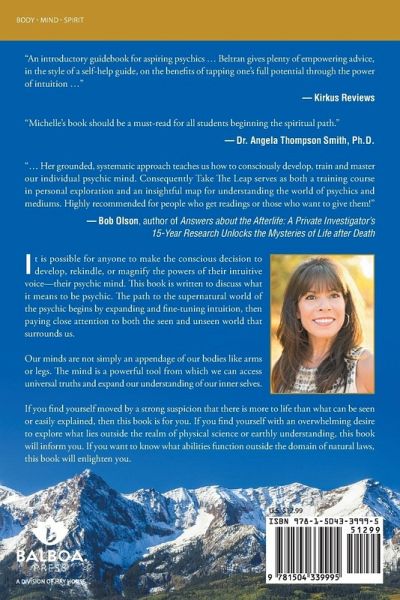 "An introductory guidebook for aspiring psychics ... Beltran gives plenty of empowering advice, in the style of a self-help guide, on the benefits of tapping one's full potential through the power of intuition ..." - Kirkus Reviews "Michelle's book should be a must-read for all students beginning the spiritual path." - Dr. Angela Thompson Smith, Ph.D. "... Her grounded, systematic approach teaches us how to consciously develop, train and master our individual psychic mind. Consequently Take The Leap serves as both a training course in personal exploration and an insightful map for understanding the world of psychics and mediums. Highly recommended for people who get readings or those who want to give them!" - Bob Olson, author of Answers about the Afterlife: A Private Investigator's 15-Year Research Unlocks the Mysteries of Life after Death It is possible for anyone to make the conscious decision to develop, rekindle, or magnify the powers of their intuitive voice-their psychic mind. This book is written to discuss what it means to be psychic. The path to the supernatural world of the psychic begins by expanding and fine-tuning intuition, then paying close attention to both the seen and unseen world that surrounds us. Our minds are not simply an appendage of our bodies like arms or legs. The mind is a powerful tool from which we can access universal truths and expand our understanding of our inner selves. If you find yourself moved by a strong suspicion that there is more to life than what can be seen or easily explained, then this book is for you. If you find yourself with an overwhelming desire to explore what lies outside the realm of physical science or earthly understanding, this book will inform you. If you want to know what abilities function outside the domain of natural laws, this book will enlighten you.