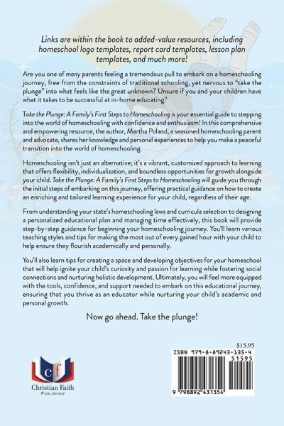 Links are within the book to added-value resources, including homeschool logo templates, report card templates, lesson plan templates, and much more! Are you one of many parents feeling a tremendous pull to embark on a homeschooling journey, free from the constraints of traditional schooling, yet nervous to "take the plunge" into what feels like the great unknown? Unsure if you and your children have what it takes to be successful at in-home educating? Take the Plunge: A Family's First Steps to Homeschooling is your essential guide to stepping into the world of homeschooling with confidence and enthusiasm! In this comprehensive and empowering resource, the author, Martha Poland, a seasoned homeschooling parent and advocate, shares her knowledge and personal experiences to help you make a peaceful transition into the world of homeschooling. Homeschooling isn't just an alternative; it's a vibrant, customized approach to learning that offers flexibility, individualization, and boundless opportunities for growth alongside your child. Take the Plunge: A Family's First Steps to Homeschooling will guide you through the initial steps of embarking on this journey, offering practical guidance on how to create an enriching and tailored learning experience for your child, regardless of their age. From understanding your state's homeschooling laws and curricula selection to designing a personalized educational plan and managing time effectively, this book will provide step-by-step guidance for beginning your homeschooling journey. You'll learn various teaching styles and tips for making the most out of every gained hour with your child to help ensure they flourish academically and personally. You'll also learn tips for creating a space and developing objectives for your homeschool that will help ignite your child's curiosity and passion for learning while fostering social connections and nurturing holistic development. Ultimately, you will feel more equipped with the tools, confidence, and support needed to embark on this educational journey, ensuring that you thrive as an educator while nurturing your child's academic and personal growth. Now go ahead. Take the plunge!