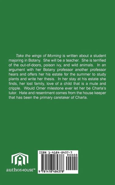 Take the wings of Morning is written about a student majoring in Botany. She will be a teacher. She is terrified of the out-of-doors, poison ivy, and wild animals. In an argument with her Botany professor another professor hears and offers her his estate for the summer to study plants and write her thesis. In her stay at his estate she finds, her lost family, love of a child that is a mute and cripple. Would Omer milestone ever let her be Charla's tutor. Hate and resentment comes from the house keeper that has been the primary caretaker of Charla.