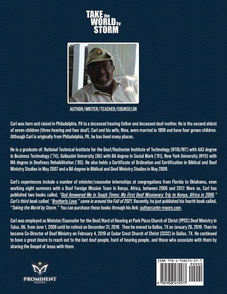 Carl was born and raised in Philadelphia, PA to a deceased hearing father and deceased deaf mother. He is the second oldest of seven children (three hearing and four deaf). Carl and his wife, Nina, were married in 1998 and have four grown children. Although Carl is originally from Philadelphia, PA, he has lived many places.He is a graduate of: National Technical Institute for the Deaf/Rochester Institute of Technology (NTID/RIT) with AAS degree in Business Technology ('74), Gallaudet University (GU) with BA degree in Social Work ('81), New York University (NYU) with MA degree in Deafness Rehabilitation ('83). He also holds a Certificate of Ordination and Certification in Biblical and Deaf Ministry Studies in May 2007 and a BA degree in Biblical and Deaf Ministry Studies in May 2009.Carl's experiences include a number of minister/counselor internships at congregations from Florida to Oklahoma, even working eight summers with a Deaf Foreign Mission Team in Kenya, Africa, between 2006 and 2017. More so, Carl has published two books called, "God Answered Me in Tough Times: My First Deaf Missionary Trip to Kenya, Africa in 2006." Carl's third book called, "Brotherly Love," came in around the Fall of 2021. Recently, he just published his fourth book called, "Taking the World by Storm." You can purchase these books through his link: authorcarlm-moore.com.Carl was employed as Minister/Counselor for the Deaf/Hard of Hearing at Park Plaza Church of Christ (PPCC) Deaf Ministry in Tulsa, OK, from June 1, 2008 until he retired on December 31, 2018. Then he moved to Dallas, TX on January 26, 2019. Then he became Co-Director of Deaf Ministry on February 4, 2019 at Cedar Crest Church of Christ (CCCC) in Dallas, TX. He continued to have a great desire to reach out to the lost deaf people, hard of hearing people, and those who associate with them by sharing the Gospel of Jesus with them.