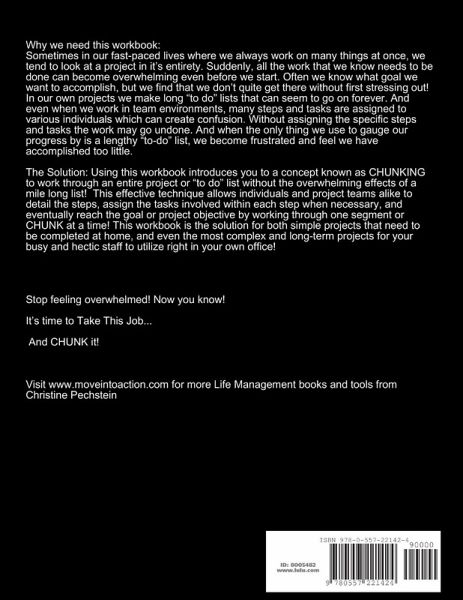 Using this workbook introduces you to a concept known as CHUNKING to work through an entire project or "to do" list without the overwhelming effects of a mile long list! This effective technique allows individuals and project teams alike to detail the steps, assign the tasks involved within each step when necessary, and eventually reach the goal or project objective by working through one segment or CHUNK at a time! This workbook is the solution for both simple projects that need to be completed at home, and even the most complex and long-term projects for your busy and hectic staff to utilize right in your own office!