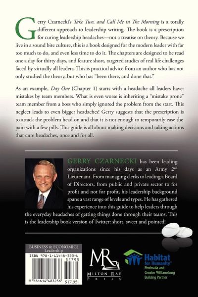 There is not a leader out there that hasn’t felt the "pain of leadership headaches." What you have here is a collection of messages that are offered as a prescription for those who find that leadership makes them feel sick, even debilitated. Being a leader is a challenge for anyone who ever wore the mantel of "boss." These readings are short, yet loaded with experience and Gerry gives you a thirty day cure for the pain of those leadership headaches.