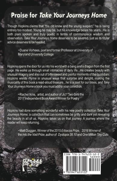 Hopkins opens the door for us into his world with a bang and a dragon from the first page. He walks us through small intimacies of daily life...He creates beauty with unusual imagery and also out of bittersweet and painful moments of the quotidian. Hopkins wields rhyme in unusual ways that surprise and delight, making the musicality of this book a read-aloud treasure...he is a poet for our times, and Take Your Journeys Home a book you must add to your collection. ~Rachel Ikins, artist, and author of Just Two Girls the 2017 Independent Book Award Winner for Poetry