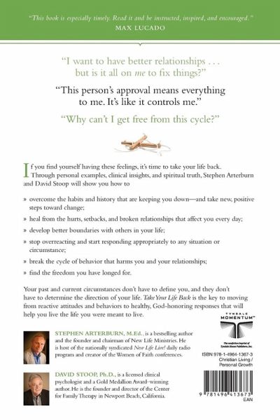 ""I want to have better relationships . . . but is it all on me to fix things?" "This person's approval means everything to me. It's like it controls me." "Why can't I get free from this cycle?" If you find yourself having these feelings, it's time to take your life back. Through personal examples, clinical insights, and spiritual truth, Stephen Arterburn and David Stoop will show you how to .overcome the habits and history that are keeping you down-and take new, positive steps toward change; .heal from the hurts, setbacks, and broken relationships that affect you every day; .develop better boundaries with others in your life; .stop overreacting and start responding appropriately to any situation or circumstance; .break the cycle of behavior that harms you and your relationships; .find the freedom you have longed for. Your past and current circumstances don't have to define you, and they don't have to determine the direction of your life. Take Your Life Back is the key to moving from reactive attitudes and behaviors to healthy, God-honoring responses that will help you live the life you were meant to live."