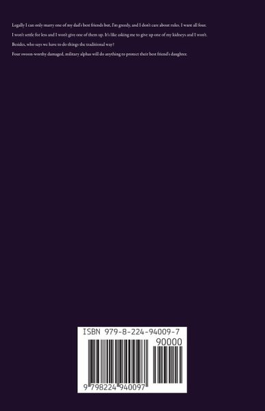 Legally I can only marry one of my dad's best friends but, I'm greedy, and I don't care about rules. I want all four. I won't settle for less and I won't give one of them up. It's like asking me to give up one of my kidneys and I won't. Besides, who says we have to do things the traditional way? Four swoon-worthy damaged, military alphas will do anything to protect their best friend's daughter. To get the most enjoyment from these books they should be read in order. Prequel - Their Sugar Baby Daddy's 4 Dirty Friends Shared by Daddy's 4 Dirty Friends Loved by Daddy's 4 Dirty Friends Claimed by Daddy's 4 Dirty Friends Taken by Daddy's 4 Dirty Friends Touched by Daddy's 4 Dirty Friends Spoiled by Daddy's 4 Dirty Friends Unwrapped by Daddy's 4 Dirty Friends Devoured by Daddy's 4 Dirty Friends Ravished by Daddy's 4 Dirty Friends Bound by Daddy's 4 Dirty Friends Craved by Daddy's 4 Dirty Friends This is a steamy page-turner of an age-gap forbidden dad's best friend ex-military contemporary reverse harem romance with four damaged military alphas. These are not stand-alone books. Each book is part of Their Temptation Series and ends in a happy for now. Series ends in a happily ever after! If you are looking for a new series to sink your teeth into this might be your cup of tea. Get comfortable and get ready to laugh, cry, swoon, and be on the edge of your seat with Daddy's 4 Dirty Friends!