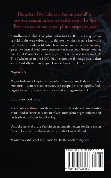 Plucked out of the Collector's Pens, auctioned off to a vampire contingent, and sent across the ocean to the Alpha Territories was not exactly how I planned to spend my week. Actually, scratch that. I had planned the first bit. But I was supposed to be sold to the werewolves so I could save my friend from a fate worse than death. Instead, the bloodsuckers have me and so far? It's not going great. I've been shoved into a corset and made to look like an extra on the cast of Bridgerton, all to take part in the Harvest Games--think The Bachelor set in the 1800's, but the men are all vampires, and then add a decidedly terrifying Squid Games element to the mix. No problem. My goal-besides keeping the number of holes in my body to the current norm-is more than surviving. It is escaping the inescapable, finding my way to the werewolf territory, and getting Jordan back. Cue the political strife. Armed with nothing more than a super sharp hairpin, my questionable charm, and an irrational amount of optimism, plans to get both me and my bestie out alive are in full swing. Until the General of the Vampire Army and his molten eyes light me on fire and leave me wondering if escape is what I want after all. Maybe one extra set of holes wouldn't be the worst thing ever...