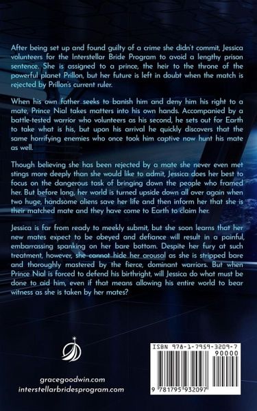 After being set up and found guilty of a crime she didn't commit, Jessica volunteers for the Interstellar Bride Program to avoid a lengthy prison sentence. She is assigned to a prince, the heir to the throne of the powerful planet Prillon, but her future is left in doubt when the match is rejected by Prillon's current ruler. When his own father seeks to banish him and deny him his right to a mate, Prince Nial takes matters into his own hands. Accompanied by a battle-tested warrior who volunteers as his second, he sets out for Earth to take what is his, but upon his arrival he quickly discovers that the same horrifying enemies who once took him captive now hunt his mate as well. Though believing she has been rejected by a mate she never even met stings more deeply than she would like to admit, Jessica does her best to focus on the dangerous task of bringing down the people who framed her. But before long, her world is turned upside down all over again when two huge, handsome aliens save her life and then inform her that she is their matched mate and they have come to Earth to claim her. Jessica is far from ready to meekly submit, but she soon learns that her new mates expect to be obeyed and defiance will result in a painful, embarrassing spanking on her bare bottom. Despite her fury at such treatment, however, she cannot hide her arousal as she is stripped bare and thoroughly mastered by the fierce, dominant warriors. But when Prince Nial is forced to defend his birthright, will Jessica do what must be done to aid him, even if that means allowing his entire world to bear witness as she is taken by her mates?