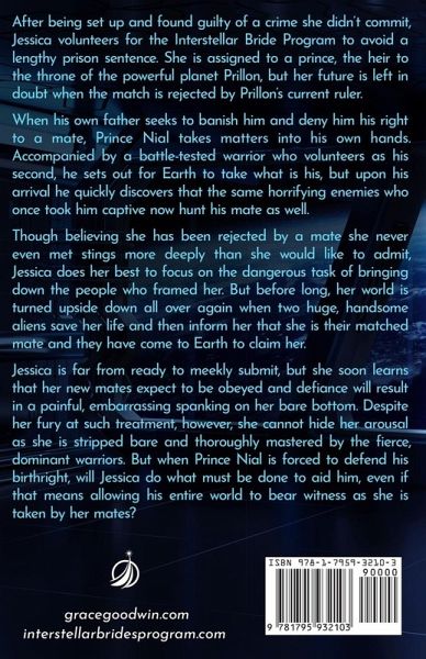 After being set up and found guilty of a crime she didn't commit, Jessica volunteers for the Interstellar Bride Program to avoid a lengthy prison sentence. She is assigned to a prince, the heir to the throne of the powerful planet Prillon, but her future is left in doubt when the match is rejected by Prillon's current ruler. When his own father seeks to banish him and deny him his right to a mate, Prince Nial takes matters into his own hands. Accompanied by a battle-tested warrior who volunteers as his second, he sets out for Earth to take what is his, but upon his arrival he quickly discovers that the same horrifying enemies who once took him captive now hunt his mate as well. Though believing she has been rejected by a mate she never even met stings more deeply than she would like to admit, Jessica does her best to focus on the dangerous task of bringing down the people who framed her. But before long, her world is turned upside down all over again when two huge, handsome aliens save her life and then inform her that she is their matched mate and they have come to Earth to claim her. Jessica is far from ready to meekly submit, but she soon learns that her new mates expect to be obeyed and defiance will result in a painful, embarrassing spanking on her bare bottom. Despite her fury at such treatment, however, she cannot hide her arousal as she is stripped bare and thoroughly mastered by the fierce, dominant warriors. But when Prince Nial is forced to defend his birthright, will Jessica do what must be done to aid him, even if that means allowing his entire world to bear witness as she is taken by her mates?