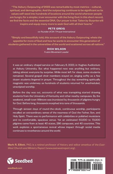It was an ordinary chapel service on February 8, 2023, in Hughes Auditorium at Asbury University. But what happened next was anything but ordinary, taking almost everyone by surprise. While most left for class, some students remained. Several gospel choir members stayed on, singing softly as a few dozen students lingered in prayer. Throughout the day something spiritually magnetic was underway as hundreds of students returned for unscheduled, unscripted worship. Before the day was out, accounts of what was transpiring started drawing students from the University of Kentucky and other nearby campuses. By the weekend, small-town Wilmore was inundated by thousands of pilgrims hungry for God. Before long, thousands morphed into tens of thousands. Through sixteen days of round-the-clock, continuous worship, participants recalled an extraordinary sense of the nearness of God the Father, Son, and Holy Spirit. There was no performance with celebrities or polished musicians and no comfortable, spacious venue. Yet an estimated 50,000 to 70,000 pilgrims came from at least 40 states, 286 campuses, and 40 countries. This work explores a spontaneous revival whose impact through social media continues to reverberate around the world.
