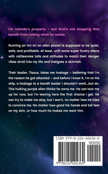 I'm nobody's property - but that's not stopping this bandit from taking what he wants. >Their leader, Tlezus, takes me hostage - believing that I'm the reason he got attacked - and before I know it, I'm on his ship, a hostage to a bandit leader I shouldn't want...but do. This hulking purple alien thinks he owns me. He can lock me up for now, but I'm leaving here the first chance I get. He can try to make me stay, but I won't, no matter how he tries to convince me. No matter how good his hands and tail feel on my skin, or how much he makes me want him. Taken by the Alien Bandit is the first book in the Mated to the Baekex Bandit series. Each book can be read as a standalone story, but you will enjoy the stories more if you read them in sequence. This book has no cliffhangers or cheating and most importantly, contains a HEA.