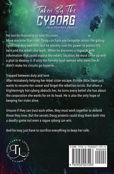 Abductions, secrets, and a cyborg's forbidden desire... Doug lost his humanity to save his sister. More machine than man, he can hack any computer across the galaxy. Syndicorp may own him, but he secretly uses his power to protect his twin and the rebels she leads. When he discovers a rogue AI with information that could expose the rebels' location, he must come up with a plan to destroy it. If only the fiercely loyal woman who owns the AI didn't make his circuits go haywire... Attie's trapped between duty and love. After mistakenly helping her rebel sister escape, Private Attie Swan just wants to resume her career and forget the rebellion exists. But when a frighteningly hot cyborg abducts her, he turns every belief she has about the corporation she works for on its head. He is also the only hope of keeping her sister alive. Unsure if they can trust each other, they must work together to defend those they love. But the secrets Doug protects could drag them both into a deadly game not even a rogue cyborg can win. And he may just have to sacrifice everything to keep her safe. Reader Promise: Steamy love scenes, dangerous cyborgs, and heart-pounding action with no cliffhangers and a guaranteed HEA. This thrilling Sci-Fi is intended for mature audiences.