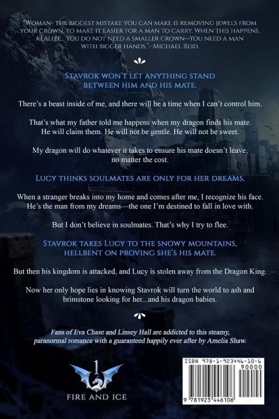 "Woman-the biggest mistake you can make is removing jewels from your crown to make it easier for a man to carry. When this happens, realize... you do not need a smaller crown-you need a man with bigger hands." - Michael Reid. Stavrok My father always told me that one day my inner beast would break free and that I'd be powerless to stop it. He said that when a dragon finds his destined mate, there's nothing between Heaven and Hell that can stop him from claiming her-and that's what scares me. I don't want to hurt the woman I'm destined to bond with, but I'll set the whole damn world on fire to protect her! Lucy For years a beautiful and fierce man has haunted my dreams. I don't know how, but I know he's my soulmate. But when he breaks into my home and tries to take me by force, I flee. But escaping the Dragon King is futile. He whisks me away to the mountains, eager to prove his devotion as my fated mate. But it's not long before ruin falls upon his kingdom, and I'm torn from his grasp... Be enthralled by this deliciously steamy, dragon shifter fated mates paranormal romance by bestselling author Amelia Shaw. It boasts sweeping adventure, high-stakes, and a guaranteed happily ever after that will steal your breath away!