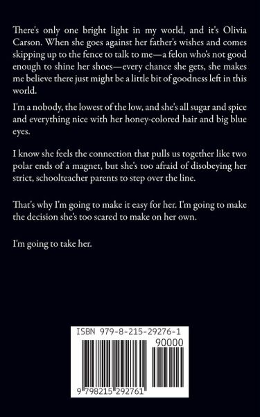 There's only one bright light in my world, and it's Olivia Carson. When she goes against her father's wishes and comes skipping up to the fence to talk to me-a felon who's not good enough to shine her shoes-every chance she gets, she makes me believe there just might be a little bit of goodness left in this world. I'm a nobody, the lowest of the low, and she's all sugar and spice and everything nice with her honey-colored hair and big blue eyes. I know she feels the connection that pulls us together like two polar ends of a magnet, but she's too afraid of disobeying her strict, schoolteacher parents to step over the line. That's why I'm going to make it easy for her. I'm going to make the decision she's too scared to make on her own. I'm going to take her.
