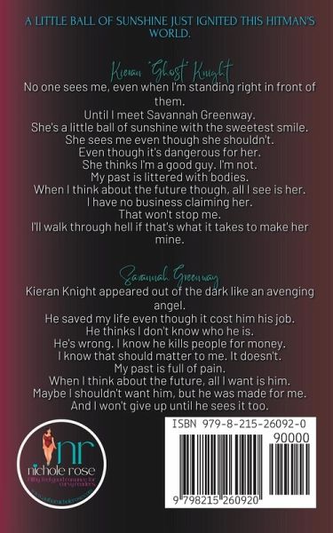 A little ball of sunshine just ignited this hitman's world. Kieran "Ghost" Knight No one sees me, even when I'm standing right in front of them. Until I meet Savannah Greenway. She's a little ball of sunshine with the sweetest smile. She sees me even though she shouldn't. Even though it's dangerous for her. She thinks I'm a good guy. I'm not. My past is littered with bodies. When I think about the future though, all I see is her. I have no business claiming her. That won't stop me. I'll walk through hell if that's what it takes to make her mine. Savannah Greenway Kieran Knight appeared out of the dark like an avenging angel. He saved my life even though it cost him his job. He thinks I don't know who he is. He's wrong. I know he kills people for money. I know that should matter to me. It doesn't. My past is full of pain. When I think about the future, all I want is him. Maybe I shouldn't want him, but he was made for me. And I won't give up until he sees it too. If you enjoy growly hitmen, sassy heroines, and age-gap romance, you'll love Kieran and Savannah's sweet and steamy story!