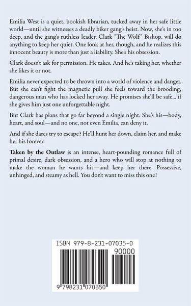 Emilia West is a quiet, bookish librarian, tucked away in her safe little world-until she witnesses a deadly biker gang's heist. Now, she's in too deep, and the gang's ruthless leader, Clark "The Wolf" Bishop, will do anything to keep her quiet. One look at her, though, and he realizes this innocent beauty is more than just a liability. She's his obsession. Clark doesn't ask for permission. He takes. And he's taking her, whether she likes it or not. Emilia never expected to be thrown into a world of violence and danger. But she can't fight the magnetic pull she feels toward the brooding, dangerous man who has locked her away. He promises she'll be safe... if she gives him just one unforgettable night. But Clark has plans that go far beyond a single night. She's his-body, heart, and soul-and no one, not even Emilia, can deny it. And if she dares try to escape? He'll hunt her down, claim her, and make her his forever. Taken by the Outlaw is an intense, heart-pounding romance full of primal desire, dark obsession, and a hero who will stop at nothing to make the woman he wants his-and keep her there. Possessive, unhinged, and steamy as hell. You don't want to miss this one!
