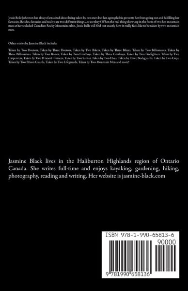 Jessie Belle Johnston has always fantasized about being taken by two men but her agoraphobia prevents her from going out and fulfilling her fantasies. Besides, fantasies and reality are two different things...or are they? When the real thing shows up in the form of two hot mountain men at her secluded Canadian Rocky Mountain cabin, Jessie Belle will find out exactly how it really feels like to be taken by two mountain men. Other stories by Jasmine Black include: Taken by Two Doctors, Taken by Three Doctors, Taken by Two Bikers, Taken by Three Bikers, Taken by Two Billionaires, Taken by Three Billionaires, Taken by Two Bosses, Taken by Two Cowboys, Taken by Three Cowboys, Taken by Two Firefighters, Taken by Two Carpenters, Taken by Two Personal Trainers, Taken by Two Santas, Taken by Two Elves, Taken by Three Bodyguards, Taken by Two Cops, Taken by Two Prison Guards, Taken by Two Lifeguards, Taken by Two Mountain Men and more!