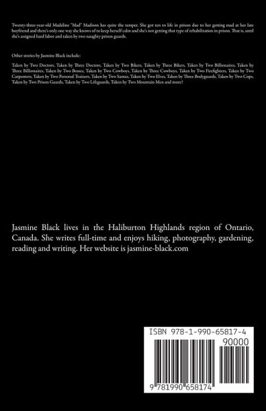 Twenty-three-year-old Madeline "Mad" Madison has quite the temper. She got ten to life in prison due to her getting mad at her late boyfriend and there's only one way she knows of to keep herself calm and she's not getting that type of rehabilitation in prison. That is, until she's assigned hard labor and taken by two naughty prison guards. Other stories by Jasmine Black include: Taken by Two Doctors, Taken by Three Doctors, Taken by Two Bikers, Taken by Three Bikers, Taken by Two Billionaires, Taken by Three Billionaires, Taken by Two Bosses, Taken by Two Cowboys, Taken by Three Cowboys, Taken by Two Firefighters, Taken by Two Carpenters, Taken by Two Personal Trainers, Taken by Two Santas, Taken by Two Elves, Taken by Three Bodyguards, Taken by Two Cops, Taken by Two Prison Guards, Taken by Two Lifeguards, Taken by Two Mountain Men and more!