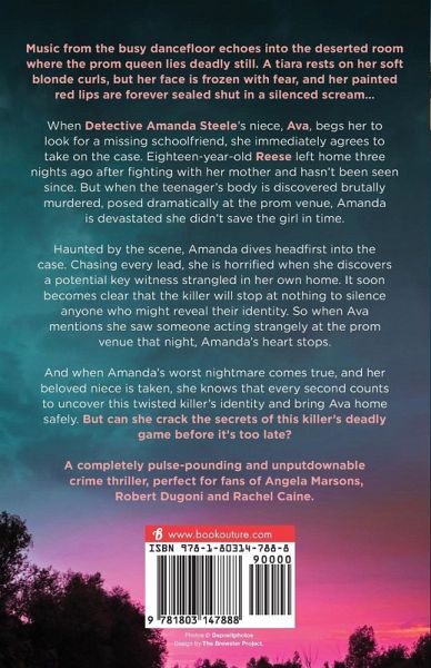 Music from the busy dancefloor echoes into the deserted room where the Prom Queen lies deadly still. A tiara rests on her soft blonde curls, but her face is frozen with fear, and her painted red lips are forever sealed shut in a silenced scream... When Detective Amanda Steele's niece, Ava, begs her to look for a missing schoolfriend, she immediately agrees to take on the case. Eighteen-year-old Reese left home three nights ago after fighting with her mother and hasn't been seen since. But when the teenager's body is discovered brutally murdered, poised dramatically at the prom venue, Amanda is devastated she didn't save the girl in time. Haunted by the scene, Amanda dives headfirst into the case. Chasing every lead, she is horrified when she discovers a potential key witness strangled in her own home. It soon becomes clear that the killer will stop at nothing to silence anyone who might reveal their identity. So when Ava mentions she saw someone acting strangely at the prom venue that night, Amanda's heart stops. And when Amanda's worst nightmare comes true, and her beloved niece is taken, she knows that every second counts to uncover this twisted killer's identity and bring Ava home safely. But can she crack the secrets of this killer's deadly game before it's too late? A completely pulse-pounding and unputdownable crime thriller, perfect for fans of Angela Marsons, Robert Dugoni and Rachel Caine. Readers love the Detective Amanda Steele series: "OMG YES. This was an amazing book... I couldn't put it down... Best book I read this year." Goodreads reviewer ¿¿¿¿¿ "My heart is still beating fast! Wow!! By far, one of the best thrillers I've read in a long time!" Goodreads reviewer ¿¿¿¿¿ "If there was a way to give more than 5 stars, I would! This book is amazing!" Goodreads reviewer ¿¿¿¿¿ "I already can't wait for the next one! This one pulls you in from the very beginning... The mystery is full of action and twists. I absolutely did not see that ending coming." Goodreads reviewer ¿¿¿¿¿